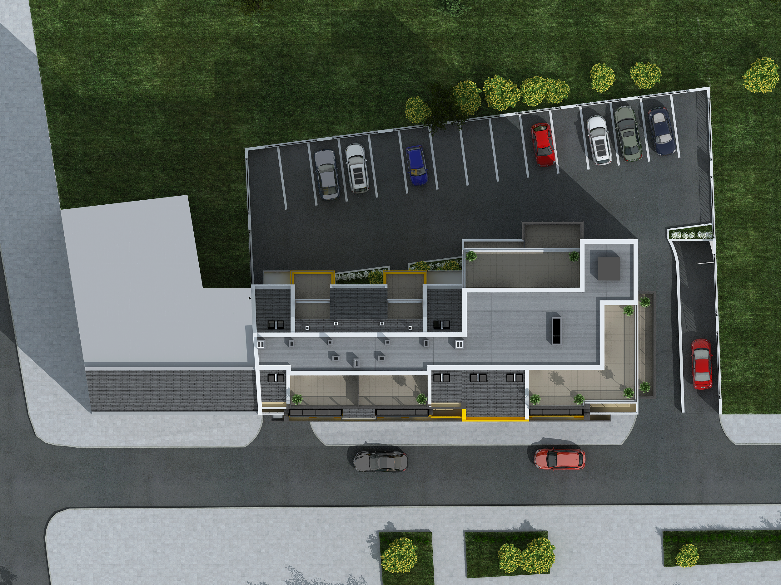 Застрояването в имота е разположено,съгласно указанията посочени в Устройствения план на района.Достъпът на сградата се осъществява от югозапад през прилежащата улица "Котленски проход".От нея в югоизточната част е предвиден проход в който е предвиден входа на жилищната част както и подхода за излизане от надземния паркинг.В северозападната част на терена е предвиден подхода към надземния паркинг както и рампата, водеща до подземният паркинг.